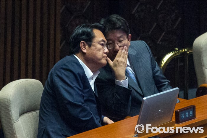 (서울=포커스뉴스) 정진석 새누리당 원내대표와 권성동 사무총장이 22일 오전 서울 여의도 국회에서 열린 본회의에 참석해 대화 하고 있다.