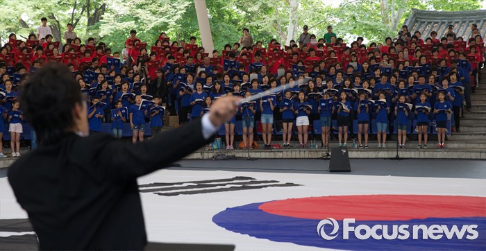 (서울=포커스뉴스) 22일 오전 서울 송파구 서울놀이마당에서 열린 '통일대합창, 625명이 함께하는 평화공감' 행사에 참가한 송파구민들이 합창하고 있다. 이번 행사는 관내 합창단과 노래동아리 등 송파구민 1000여명이 신청해 2주전부터 개별적으로 연습 한 후 통일대합창에 참가 했다.