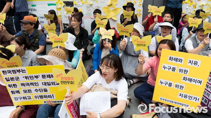 (서울=포커스뉴스) 22일 오후 서울 종로구 옛 일본대사관 앞에서 제1236차 일본군 위안부 문제해결을 위한 정기수요집회가 열리고 있다.