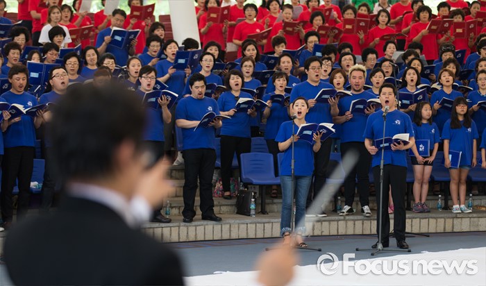 (서울=포커스뉴스) 22일 오전 서울 송파구 서울놀이마당에서 열린 '통일대합창, 625명이 함께하는 평화공감' 행사에 참가한 송파구민들이 합창하고 있다. 이번 행사는 관내 합창단과 노래동아리 등 송파구민 1000여명이 신청해 2주전부터 개별적으로 연습 한 후 통일대합창에 참가 했다.