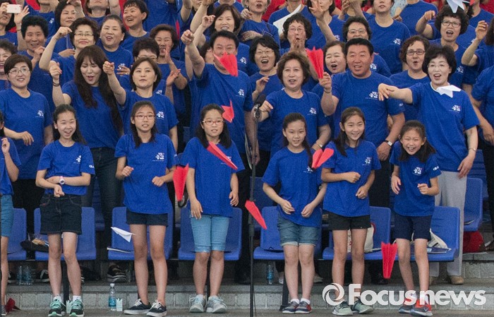(서울=포커스뉴스) 22일 오전 서울 송파구 서울놀이마당에서 열린 '통일대합창, 625명이 함께하는 평화공감' 행사에 참가한 송파구민들이 합창을 마치고 종이비행기를 날리고 있다. 이번 행사는 관내 합창단과 노래동아리 등 송파구민 1000여명이 신청해 2주전부터 개별적으로 연습 한 후 통일대합창에 참가 했다.