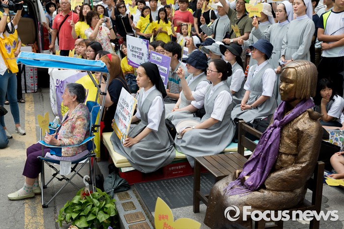 (서울=포커스뉴스) 22일 오후 서울 종로구 옛 일본대사관 앞에서 제1236차 일본군 위안부 문제해결을 위한 정기수요집회가 열리고 있다.