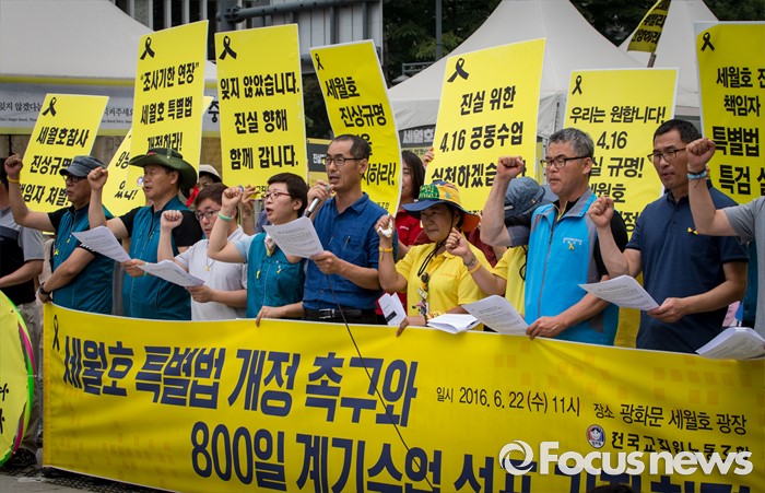 (서울=포커스뉴스) 세월호 참사 800일을 하루 앞둔 22일 오전 서울 종로구 광화문 광장에서 열린 '세월호 특별법 개정 촉구와 800일 계기수업 선포' 기자회견에 참석한 전국교직원노동조합 조합원들이 구호를 외치고 있다.