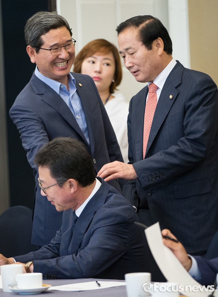 (서울=포커스뉴스)22일 오후 서울 여의도 국회에서 열린 비박계 새누리당 의원들이 주축이 된 '대한민국 미래혁신포럼' 창립 총회에서 김학용(왼쪽) 의원이 동료의원들과 인사를 나누고 있다.