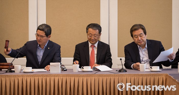 (서울=포커스뉴스)김학용 새누리당 의원이 22일 오후 서울 여의도 국회에서 열린 비박계 새누리당 의원들이 주축이 된 '대한민국 미래혁신포럼' 창립 총회에서 의사봉을 두드리고 있다. 오른쪽 첫번째는 김무성 전 대표
