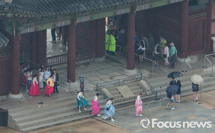 (서울=포커스뉴스) 중부지방에 첫 장맛비가 내리는 22일 오후 서울 경복궁에서 관광객들이 빗줄기 속에 나들이를 즐기고 있다. 기상청은 이번 장마전선이 오늘 밤 다시 남하해 비가 소강상태를 보였다가 모레 다시 북상할 것으로 전망했다.