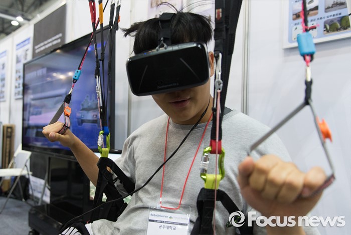 (고양=포커스뉴스) 22일 오후 경기 고양시 킨텍스 7홀에서 열린 2016 로보유니버스 & VR 서밋에 방문한 한 시민이 VR 기기를 체험하고 있다.
