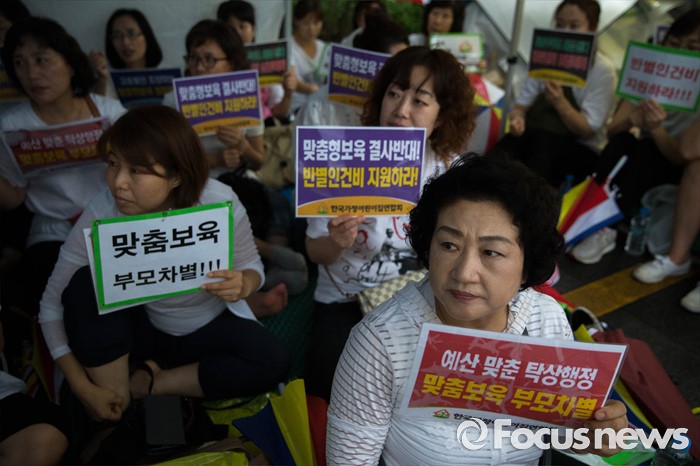 (서울=포커스뉴스) 22일 오후 서울 여의도 산업은행 본점 후문에서 한국가정어린이집연합회 비대위가 주최하는 '맞춤형 복지 시행 반대 단식 농성'이 열리고 있다.