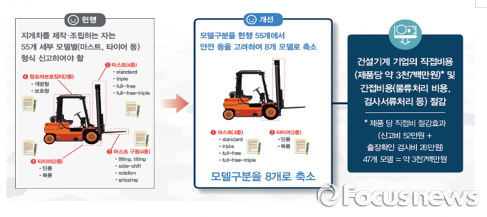 정부는 형식신고 대상 축소로 47개 모델에 대한 신고비와 출장확인 검사비가 없어져 지게차 한 대당 3700만원가량의 비용절감 효과가 발생할 것으로 추산했다.