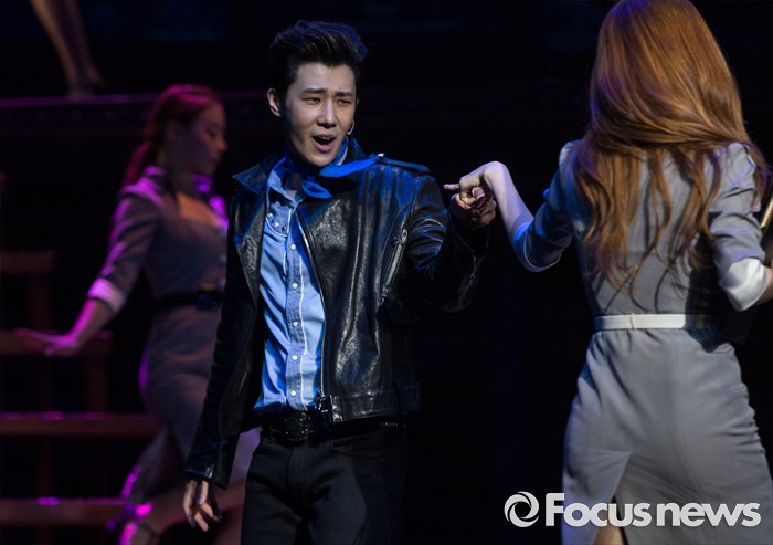 (서울=포커스뉴스) 22일 오후 서울 종로구 홍익대학고 대학로 아트센터에서 열린 뮤지컬 '올슉업' 프레스콜에 참여한 배우 김성규가 주요장면을 시연하고 있다.