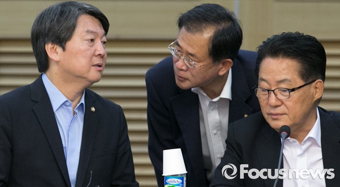 (서울=포커스뉴스) 23일 오전 서울 여의도 국회에서 열린 국민의당 19차 정책역량강화 워크숍에 참석한 안철수(왼쪽부터) 상임공동대표, 윤영일 의원, 박지원 원내대표가 대화하고 있다.