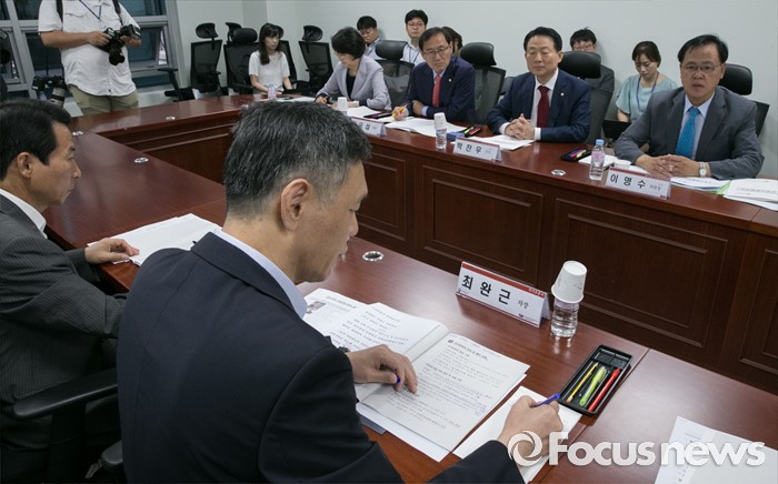 (서울=포커스뉴스) 23일 오전 서울 여의도 국회 의원회관에서 국가유공자 처우 개선 등 논의를 위해 열린 새누리당 민생혁신특별위원회-국가보훈처 간담회에 참석한 최완근(왼쪽 두번째) 국가보훈처 차장이 이명수(오른쪽 첫번째) 새누리당 민생혁신특위 위원장의 발언을 듣고 있다.