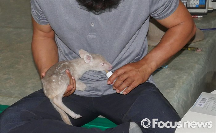 (파주 포커스뉴스) 흰고라니 새끼를 구조한 강현철씨가 23일 오전 우유를 먹이고 있다. <사진제공=노영대 한국자연정보원 원장>