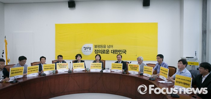 (서울=포커스뉴스) 심상정 정의당 상임대표와 노회찬 원내대표 등 의원 및 당직자들이 23일 오전 서울 여의도 국회에서 상무위원회에 앞서 정부 맞춤형 보육 시행반대 피켓 퍼포먼스를 하고 있다.
