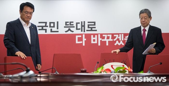 (서울=포커스뉴스) 정진석 새누리당 원내대표와 김희옥 혁신위원장이 23일 오전 서울 여의도 새누리당 당사에서 열린 혁신비상대책위원회 회의에 참석하고 있다.
