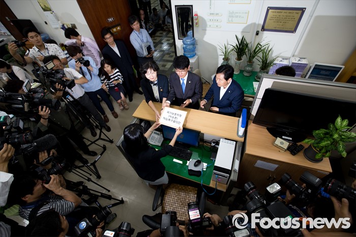 (서울=포커스뉴스) 야3당 원내수석부대표들이 23일 오전 서울 여의도 국회 의안과에서 박승춘 국가보훈처장 해임촉구결의안을 전달 하고 있다. 왼쪽부터 이정미 정의당 원내수석부대표, 박완주 더불어민주당 원내수석부대표, 김관영 국민의당 원내수석부대표.