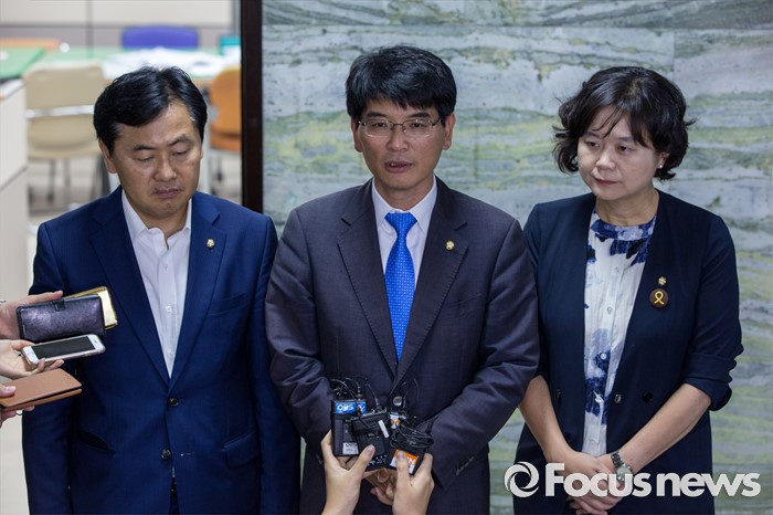 (서울=포커스뉴스) 야3당 원내수석부대표들이 23일 오전 서울 여의도 국회 의안과에서 박승춘 국가보훈처장 해임촉구결의안을 전달한 뒤 취재진 질문에 답하고 있다. 왼쪽부터 이정미 정의당 원내수석부대표, 박완주 더불어민주당 원내수석부대표, 김관영 국민의당 원내수석부대표.