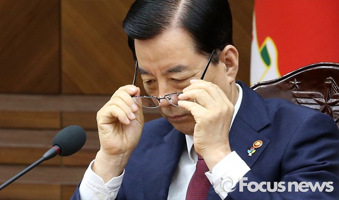 (서울=포커스뉴스) 북한이 무수단급 중거리 탄도미사일을 발사한 다음날인 23일 오전 서울 용산구 국방부 대회의실에서 열린 '2016년 전반기 전군 주요지휘관 회의'에 참석한 한민구 국방부 장관이 안경을 고쳐쓰고 있다.