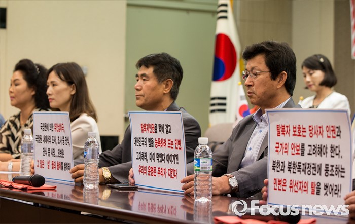 (서울=포커스뉴스) 23일 오전 서울 중구 프레스센터에서 열린 '12명 탈북민들을 사지로 내모는 민변 규탄 및 고발' 기자회견에서 탈북민단체연합 회원들이 민변을 규탄하는 손팻말을 들고 있다.
