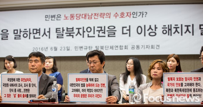 (서울=포커스뉴스) 23일 오전 서울 중구 프레스센터에서 열린 '12명 탈북민들을 사지로 내모는 민변 규탄 및 고발' 기자회견에서 탈북민단체연합 회원들이 민변을 규탄하는 손팻말을 들고 있다.