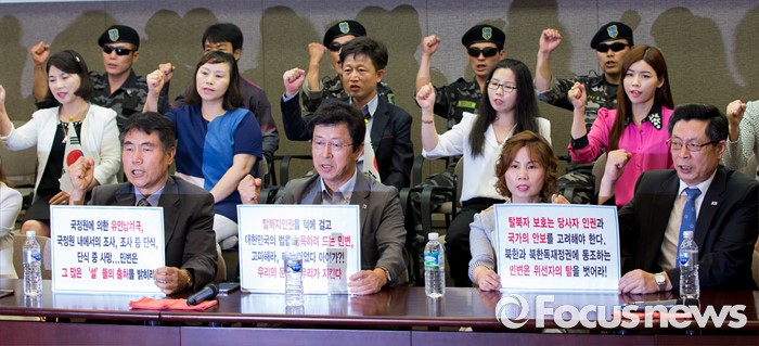 (서울=포커스뉴스) 23일 오전 서울 중구 프레스센터에서 열린 '12명 탈북민들을 사지로 내모는 민변 규탄 및 고발' 기자회견에서 탈북민단체연합 회원들이 민변을 규탄하는 구호를 외치고 있다.