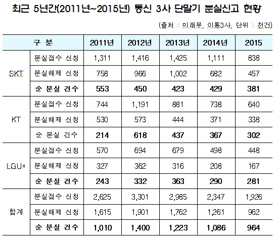 녹색소비자연대 전국협의회 정보통신소비자정책연구원(이하 ICT소비자정책연구원)이 23일 미래창조과학부, 이동통신3사로부터 제공받은 ‘최근 5년간 이동통신 3사 단말기 분실신고 현황’ 자료를 분석한 결과를 내놨다.
