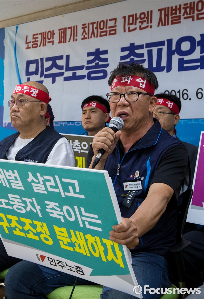 (서울=포커스뉴스) 23일 오전 서울 중구 민주노총 대회의실에서 열린 '민주노총 총파업ㆍ총력투쟁 선포' 기자회견에 참석한 최종진 수석부위원장이 총파업을 결의하는 발언을 하고 있다.