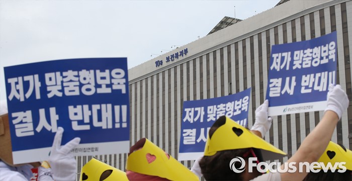 (세종=포커스뉴스) 23일 오전 세종시 정부세종청사 보건복지부 앞에서 충남민간어린이집연합회 회원들이 맞춤형보육 제도개선 및 시행연기 촉구 결의대회를 열고 있다.