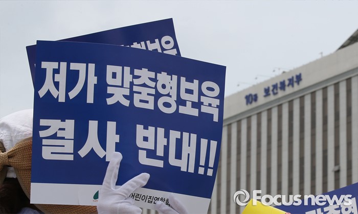 (세종=포커스뉴스) 23일 오전 세종시 정부세종청사 보건복지부 앞에서 충남민간어린이집연합회 회원들이 맞춤형보육 제도개선 및 시행연기 촉구 결의대회를 열고 있다.