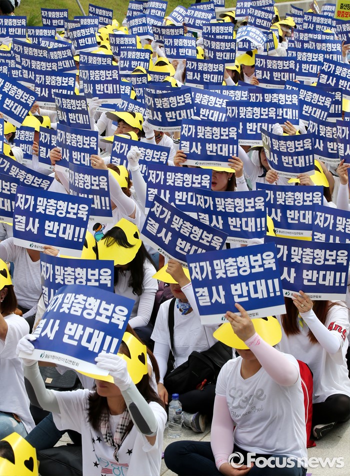 (세종=포커스뉴스) 23일 오전 세종시 정부세종청사 보건복지부 앞에서 충남민간어린이집연합회 회원들이 맞춤형보육 제도개선 및 시행연기 촉구 결의대회를 열고 있다.