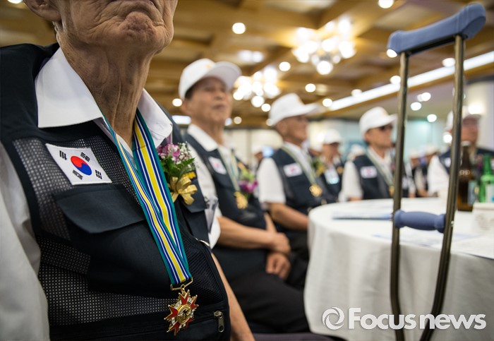(서울=포커스뉴스) 23일 오전 서울 용산구 전쟁기념관 뮤지엄 웨딩홀에서 참전유공자들이 '6.25전쟁 참전유공자 위로연 및 호국영웅기장 전수식'에 참석하고 있다.