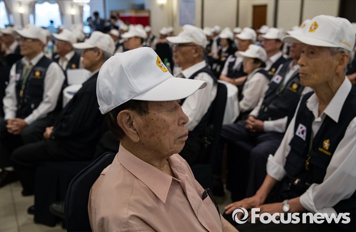 (서울=포커스뉴스) 23일 오전 서울 용산구 전쟁기념관 뮤지엄 웨딩홀에서 참전유공자들이 '6.25전쟁 참전유공자 위로연 및 호국영웅기장 전수식'에 참석하고 있다.