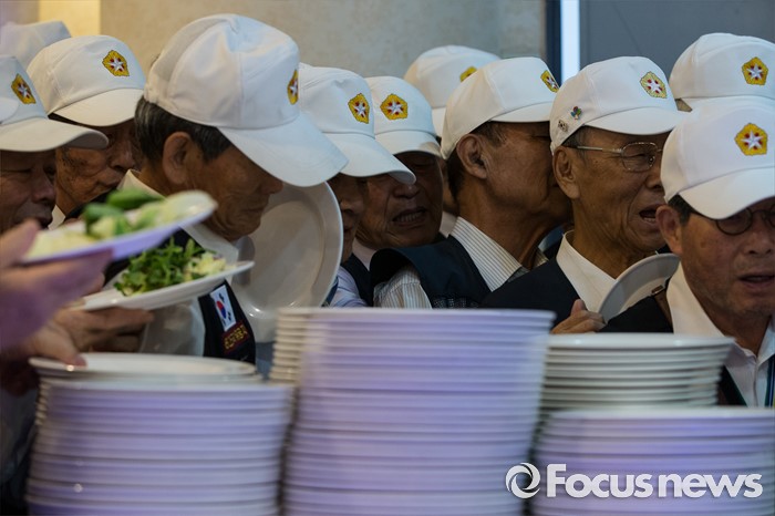 (서울=포커스뉴스) 23일 오전 서울 용산구 전쟁기념관 뮤지엄 웨딩홀에서 참전유공자들이 '6.25전쟁 참전유공자 위로연'에 참석해 식사를 준비하고 있다.