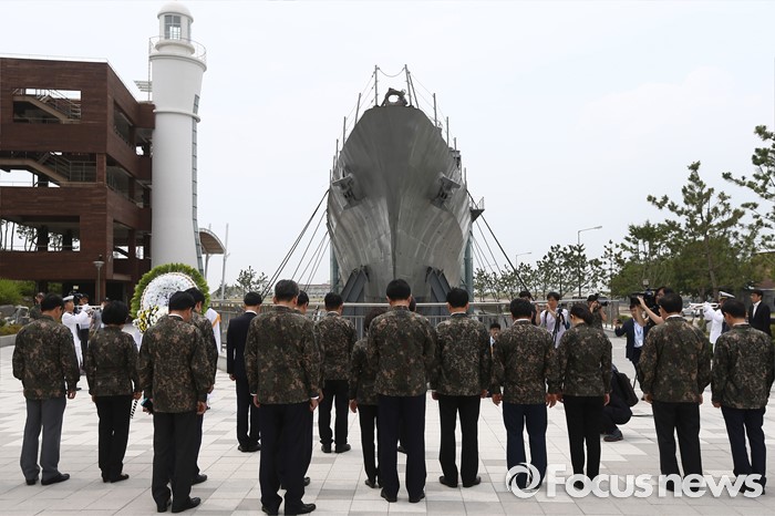 (서울=포커스뉴스) 안철수 국민의당 상임공동대표, 박지원 원내대표 등 의원들이 23일 오전 경기도 평택 해군 제2함대 사령부를 방문해 천안함 앞에서 묵념을 하고 있다.