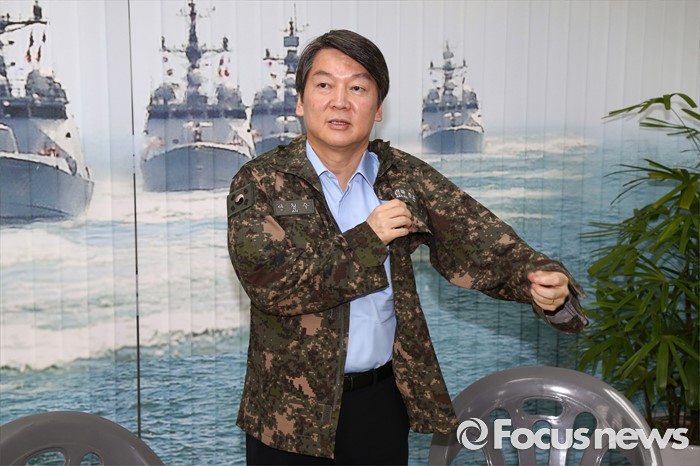 (서울=포커스뉴스) 안철수 국민의당 상임공동대표가 23일 오전 경기도 평택 해군 제2함대 사령부를 방문해 군복을 입고 있다.