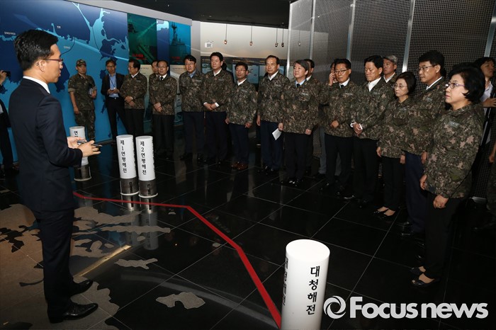 (서울=포커스뉴스) 안철수 국민의당 상임공동대표, 박지원 원내대표 등 의원들이 23일 오전 경기도 평택 해군 제2함대 사령부를 방문해 서해수호관을 둘러보고 있다.