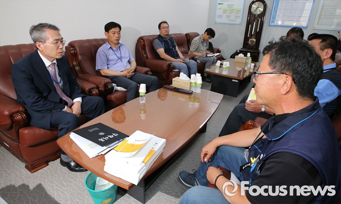 (세종=포커스뉴스) 최종진 민주노총 위원장 직무대행과 관계자들이 23일 오후 세종시 정부세종청사 고용노동부 최저임금위원장실에서 최저임금 1만원 서명지를 박준성 최저임금위원회 위원장에게 전달에 앞서 면담을 갖고 있다.