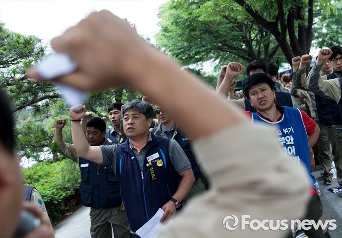 (서울=포커스뉴스) 23일 오후 서울 영등포구 KDB 산업은행 앞에서 STX조선해양노조원들이 일방적 조선업 구조조정 중단 및 공적자금 사용 내역 공개를 요구하는 결의대회를 하고 있다.
