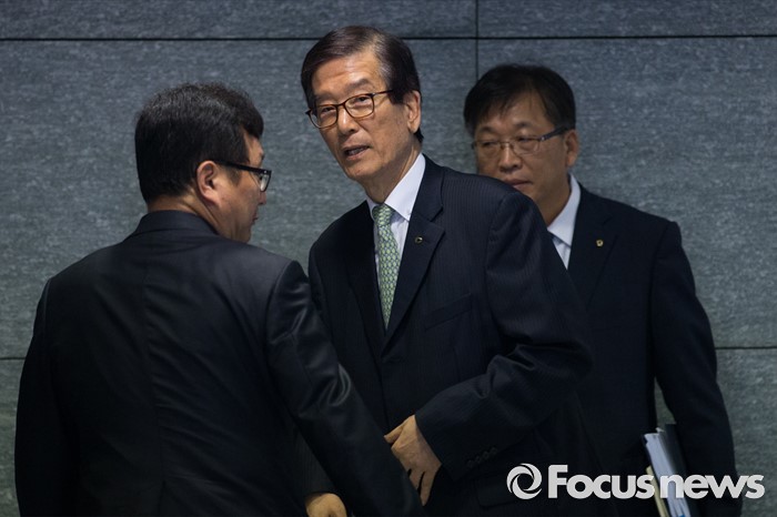(서울=포커스뉴스) 이동걸(가운데) KDB산업은행 회장이 23일 오후 서울 영등포구 KDB산업은행 본점에서 열린 산업은행 혁신 추진방안 기자간담회에 참석 전 임원들과 대화를 나누고 있다.