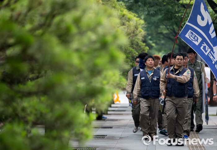(서울=포커스뉴스) 23일 오후 서울 영등포구 KDB 산업은행 앞에서 STX조선해양노조원들이 일방적 조선업 구조조정 중단 및 공적자금 사용 내역 공개를 요구하는 결의대회를 하고 있다.