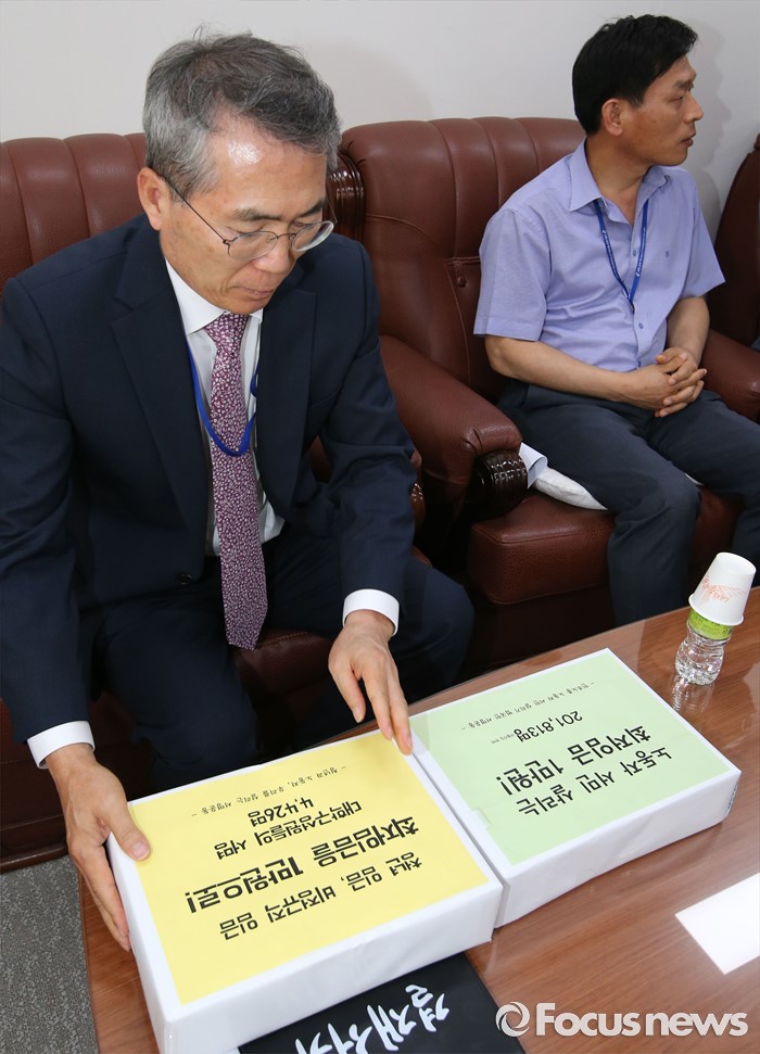 (세종=포커스뉴스) 박준성 최저임금위원회 위원장이 23일 오후 세종시 정부세종청사 고용노동부 최저임금위원장실에서 최종진 민주노총 위원장 직무대행과 관계자들로부터 최저임금 1만원 서명지를 받고 있다.