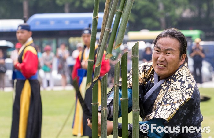 (서울=포커스뉴스) 23일 오후 서울광장에서 열린 '왕궁수문장 20주년 기념행사'에 참석한 관계자가 진검 대나무 베기 시범을 보이고 있다.
