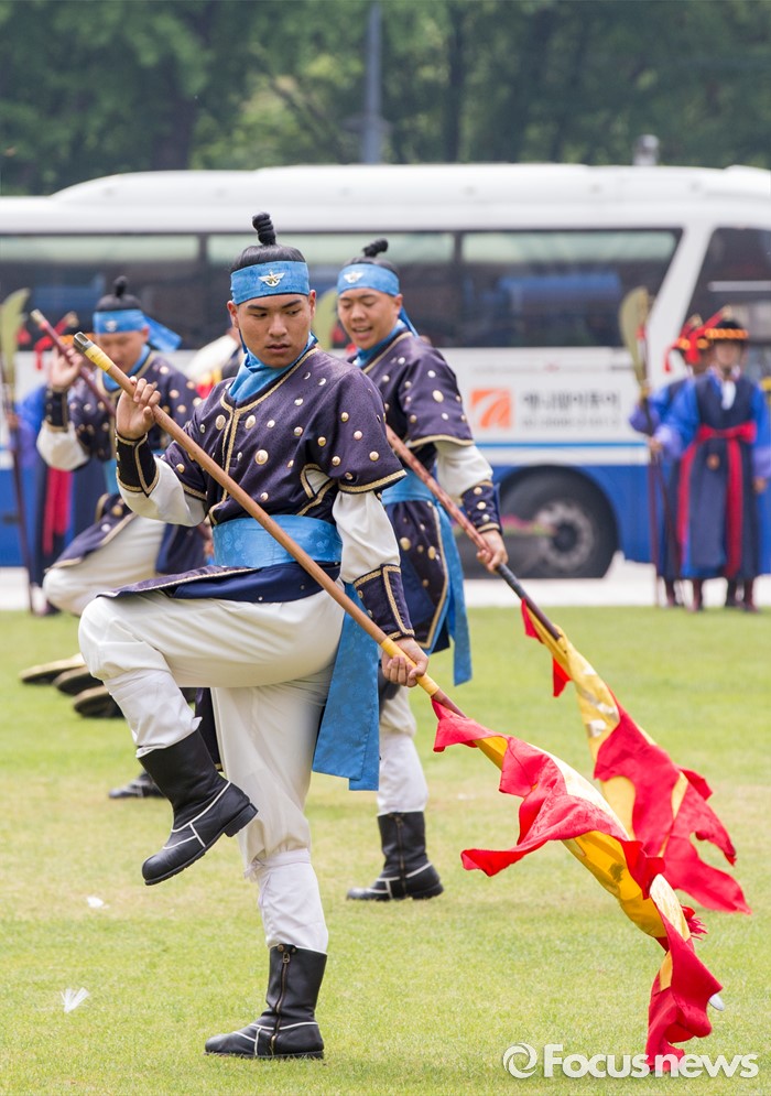 서울=포커스뉴스) 23일 오후 서울광장에서 열린 '왕궁수문장 20주년 기념행사'에 참석한 국방부 전통의장대원들이 무예 시범을 보이고 있다.