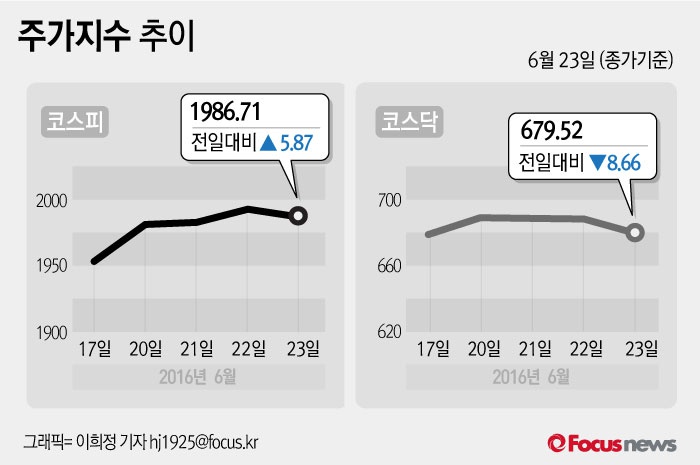 (서울=포커스뉴스) 23일 코스피지수는 전날 보다 0.29%(5.87포인트) 내린 1986.71에 장을 마쳤다. 코스닥지수는 전일 대비 1.26%(8.66포인트) 내린 679.52에 마감했다.
