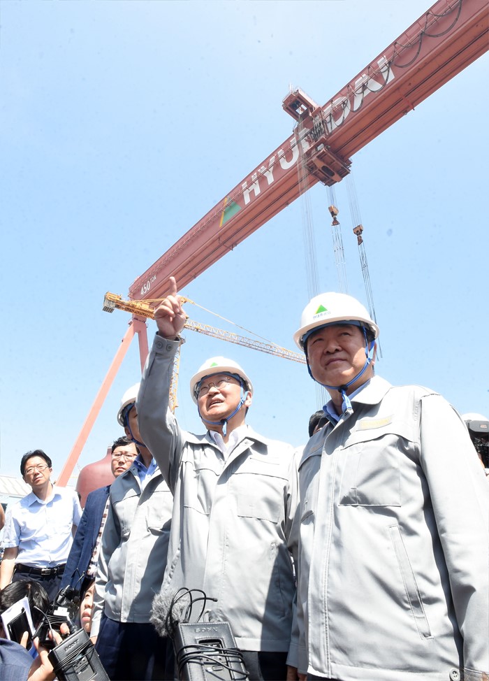 (울산=포커스뉴스) 유일호 부총리 겸 기획재정부 장관이 23일 구조조정 관련 현장방문으로 현대중공업 울산조선소에서 관계자로부터 선박건조 현장 설명을 듣고 있다. <사진제공=기획재정부>