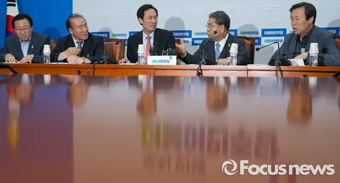 (서울=포커스뉴스) 23일 오후 서울 여의도 국회에서 열린 누리과정 및 지방교육재정 해결 위한 전국시도교육감협의회와 간담회에 참석한 우상호 더불어민주당 원내대표와 교육감들이 대화하고 있다. 왼쪽부터 민병희 강원도교육감, 장휘국 전국시도교육감협의회장(광주시교육감), 우 원내대표, 이재정 경기도교육감, 도종환 교육문화체육관광위원회 간사.