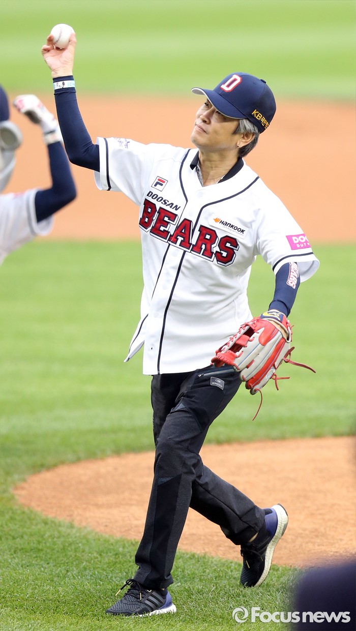 (서울=포커스뉴스) 23일 서울 잠실구장에서 열린 2016 프로야구 kt-두산 경기에서 두산 오재원의 1천 경기 기념식에 맞춰 부친 오병현씨가 시구하고 있다.