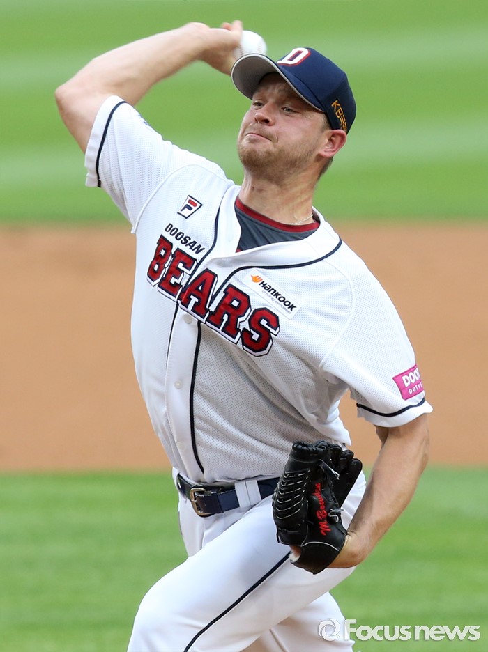 (서울=포커스뉴스) 23일 서울 잠실구장에서 열린 2016 프로야구 kt-두산 경기에서 1회초 두산 선발투수 보우덴이 투구하고 있다.