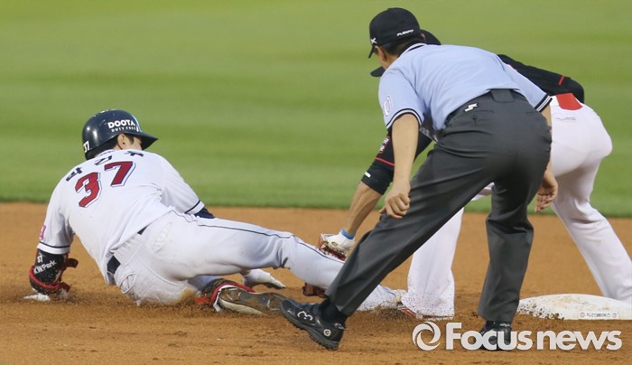 (서울=포커스뉴스) 23일 서울 잠실구장에서 열린 2016 프로야구 kt-두산 경기 3회말 1사 1루에서 두산 박건우가 주자를 불러 들이는 우중간 2루타를 치고 주루플레이 실수로 2루에서 태그아웃되고 있다.