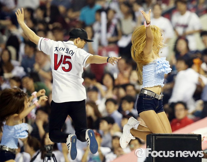 (서울=포커스뉴스) 23일 서울 잠실구장에서 열린 2016 프로야구 kt-두산 경기에서 두산 치어리더와 치어보이가 관중들에게 정열적인 춤을 선사하고 있다.